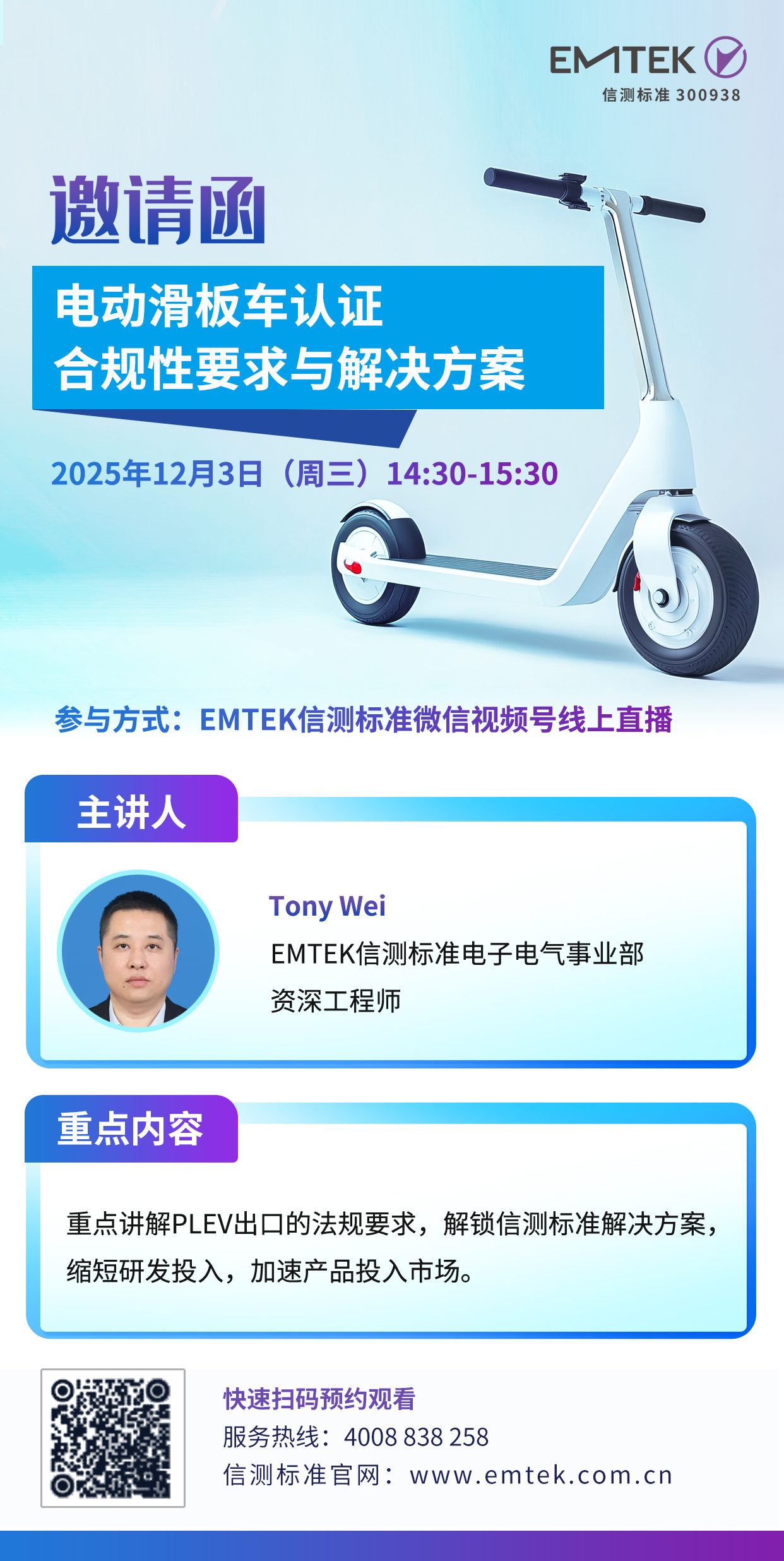 為幫助您撥開全球市場的合規(guī)迷霧,我們特此在12月3日(本周三)下午2點30分于信測標(biāo)準(zhǔn)微信視頻號舉辦 “電動滑板車認(rèn)證合規(guī)性要求與解決方案”線上技術(shù)分享直播。本次會議將深度解析歐盟、美國、以色列、西班牙、澳洲、俄羅斯等多國熱門市場的核心認(rèn)證要求,并分享高效通過認(rèn)證的實戰(zhàn)策略與解決方案。