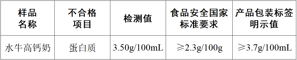 蛋白質(zhì)是由氨基酸以肽鍵連接在一起,并形成一定空間結(jié)構(gòu)的高分子有機(jī)化合物。蛋白質(zhì)是構(gòu)成機(jī)體組織、器官的重要成分,是構(gòu)成機(jī)體多種重要生理活性物質(zhì)的成分,還能供給能量?!妒称钒踩珖覙?biāo)準(zhǔn) 調(diào)制乳》(GB 25191—2010)中規(guī)定,調(diào)制乳的蛋白質(zhì)含量應(yīng)≥2.3 g/100g,且該產(chǎn)品外包裝標(biāo)簽明示“優(yōu)質(zhì)乳蛋白≥3.7g/100mL”,檢測(cè)結(jié)果單位換算后,受檢本批次產(chǎn)品中蛋白質(zhì)的檢測(cè)值符合食品安全國家標(biāo)準(zhǔn)規(guī)定,但不符合產(chǎn)品明示質(zhì)量要求。