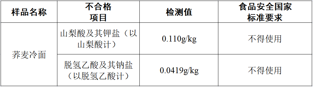 蕎麥冷面中檢出山梨酸及其鉀鹽(以山梨酸計(jì))的原因,可能是企業(yè)為延長(zhǎng)產(chǎn)品保質(zhì)期、或者彌補(bǔ)產(chǎn)品生產(chǎn)過程中衛(wèi)生條件不佳而超范圍使用。