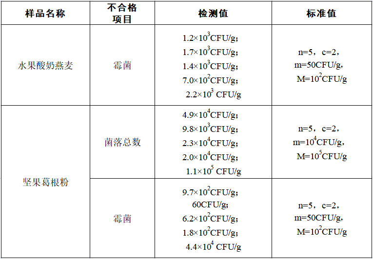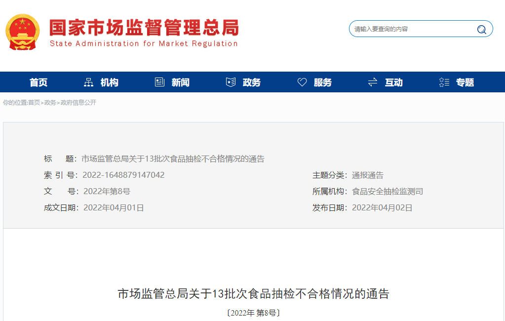近期,國家市場(chǎng)監(jiān)管總局組織食品安全監(jiān)督抽檢,抽取糧食加工品、食用農(nóng)產(chǎn)品、食糖、茶葉及相關(guān)制品、乳制品、飲料、酒類、糕點(diǎn)、炒貨食品及堅(jiān)果制品、餅干、淀粉及淀粉制品、方便食品、薯類和膨化食品、蛋制品、豆制品、蜂產(chǎn)品、蔬菜制品、水果制品、肉制品、水產(chǎn)制品、調(diào)味品、冷凍飲品、速凍食品、糖果制品、嬰幼兒配方食品、特殊膳食食品和食用油、油脂及其制品等27大類食品650批次樣品,檢出其中糧食加工品、乳制品、糕點(diǎn)、方便食品、薯類和膨化食品、水果制品和嬰幼兒配方食品等7大類食品13批次樣品不合格。