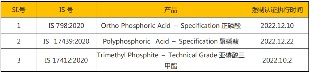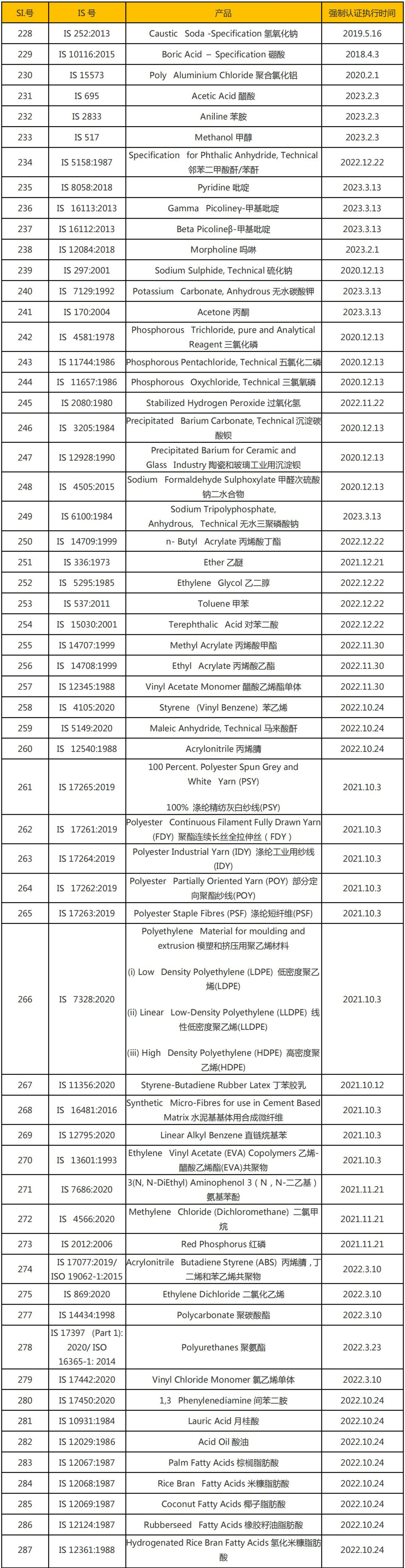 凡列入強(qiáng)制認(rèn)證的產(chǎn)品,都需按印度標(biāo)準(zhǔn)獲得產(chǎn)品認(rèn)證證書后才能進(jìn)入印度市場(chǎng)。以下列出了最新的印度BIS 強(qiáng)制認(rèn)證化學(xué)品清單及它們的執(zhí)行時(shí)間。