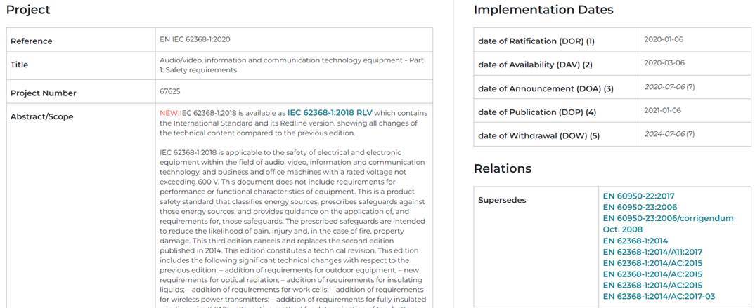為了解決這一問題,并綜合考慮到未來(lái)EN IEC 62368-1第四版的出版,以及它在EUOJ中LVD和RED下的潛在引用,經(jīng)過(guò)TC108X成員投票,大多數(shù)成員同意將EN IEC 62368-1:2020(第三版)的強(qiáng)制執(zhí)行日期延長(zhǎng)18個(gè)月至2024年7月6日。在此日期之前,仍然可以使用EN 62368-1:2014(第二版)申請(qǐng)CE。如下為CENELEC網(wǎng)站更新公示信息,EN IEC 62368-1:2020(第三版)的DOW是2024年7月6日。