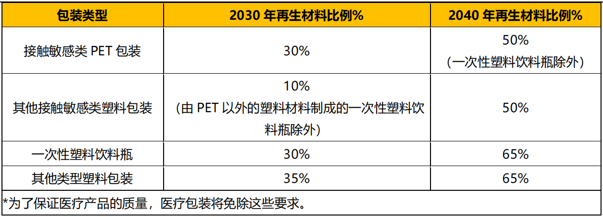 再生材料比例目標(biāo)PPWR 提案針對(duì)特定包裝類別,規(guī)定了強(qiáng)制性再生材料含量比例,相關(guān)要求自 2030 年 1 月 1 日起實(shí)施。