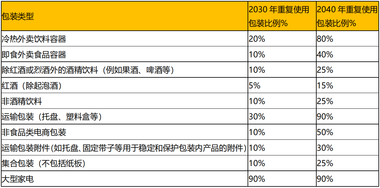 PPWR 提案擬定了運(yùn)輸包裝、電商包裝等的強(qiáng)制性重復(fù)使用包裝比例,自 2030 年 1 月 1 日起實(shí)施。