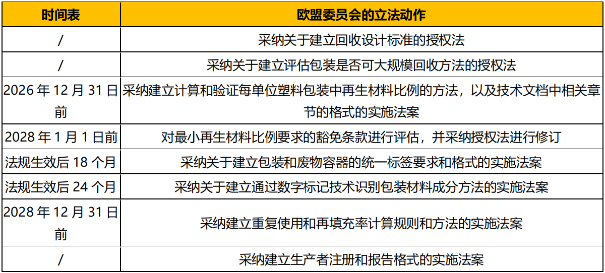 對(duì)于法規(guī)落地的一些協(xié)調(diào)標(biāo)準(zhǔn)和實(shí)施規(guī)范,目前仍未完善,但是 PPWR 提案中給出了計(jì)劃采取的立法動(dòng)作以及相應(yīng)的時(shí)間規(guī)劃,包括但不限于下表。雖然這些計(jì)劃未來(lái)仍有可能變動(dòng),但也可為相關(guān)企業(yè)規(guī)劃產(chǎn)品包裝設(shè)計(jì)升級(jí)、材料更新?lián)Q代提供參考。