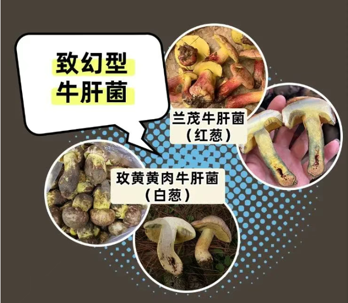 我國致幻型蘑菇中毒主要有兩種類型,一種是由產(chǎn)生裸蓋菇素的毒蘑菇引起,一種是由致幻型牛肝菌引起(毒素未知),如蘭茂牛肝菌,屬于“見手青”的一種,又稱紅蔥。