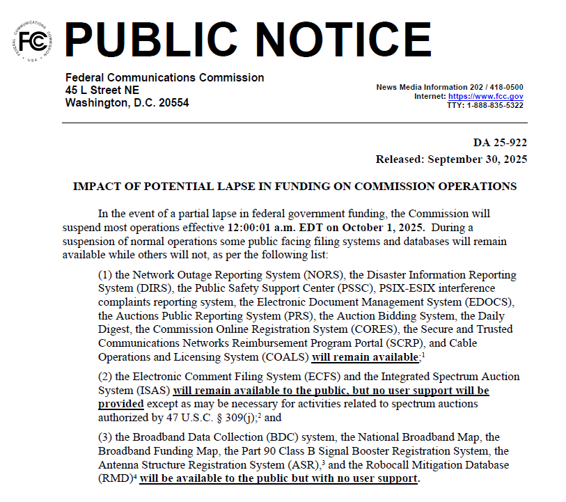 10月1日起,美國(guó)聯(lián)邦通信委員會(huì)(FCC)因聯(lián)邦政府資金未到位,正式啟動(dòng)了應(yīng)急停擺程序。受此影響,暫停運(yùn)營(yíng)期間所有FCC ID認(rèn)證的簽發(fā)工作均已暫停。此次暫停屬于不可抗力事件,具體的恢復(fù)運(yùn)營(yíng)時(shí)間需等待FCC的官方進(jìn)一步通知。電子產(chǎn)品上市節(jié)奏將被影響,哪些環(huán)節(jié)被按下暫停鍵?您的認(rèn)證、庫(kù)存、銷售會(huì)受多大波及?下文帶您一起關(guān)注。