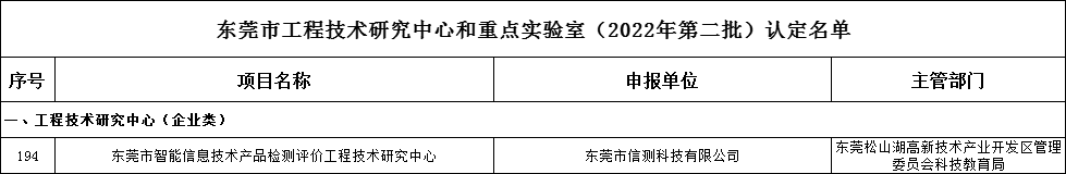近日,東莞市科學(xué)技術(shù)局發(fā)布《市科技局關(guān)于認(rèn)定東莞市工程技術(shù)研究中心和重點(diǎn)實(shí)驗(yàn)室(2022年第二批)的通知》,東莞市信測(cè)科技有限公司申報(bào)的東莞市智能信息技術(shù)產(chǎn)品檢測(cè)評(píng)價(jià)工程技術(shù)研究中心被正式認(rèn)定為東莞市工程技術(shù)研究中心。