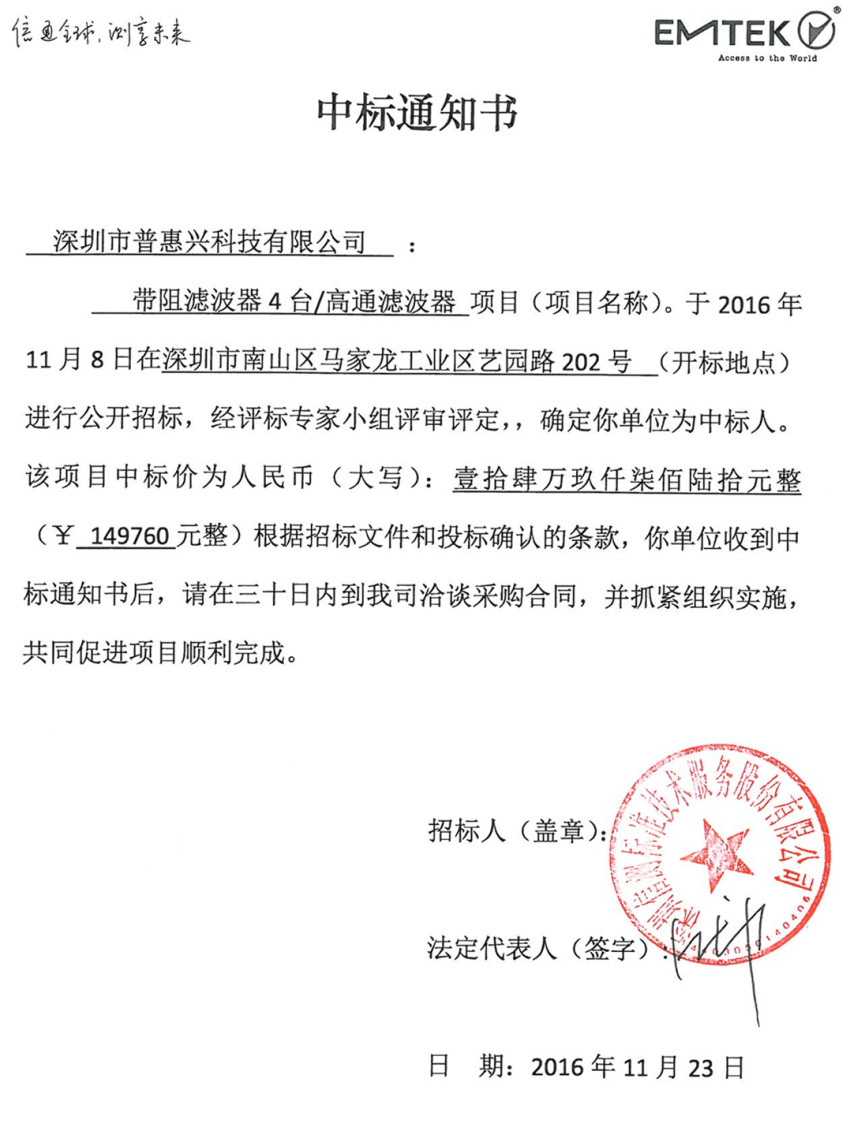 普惠興中標(biāo)通知書